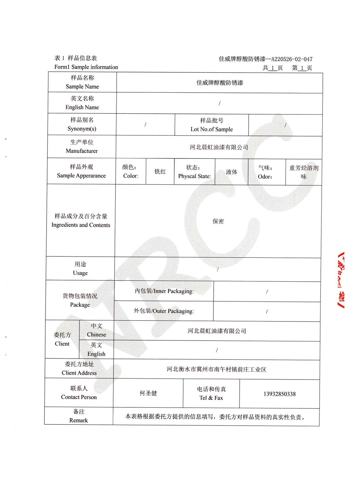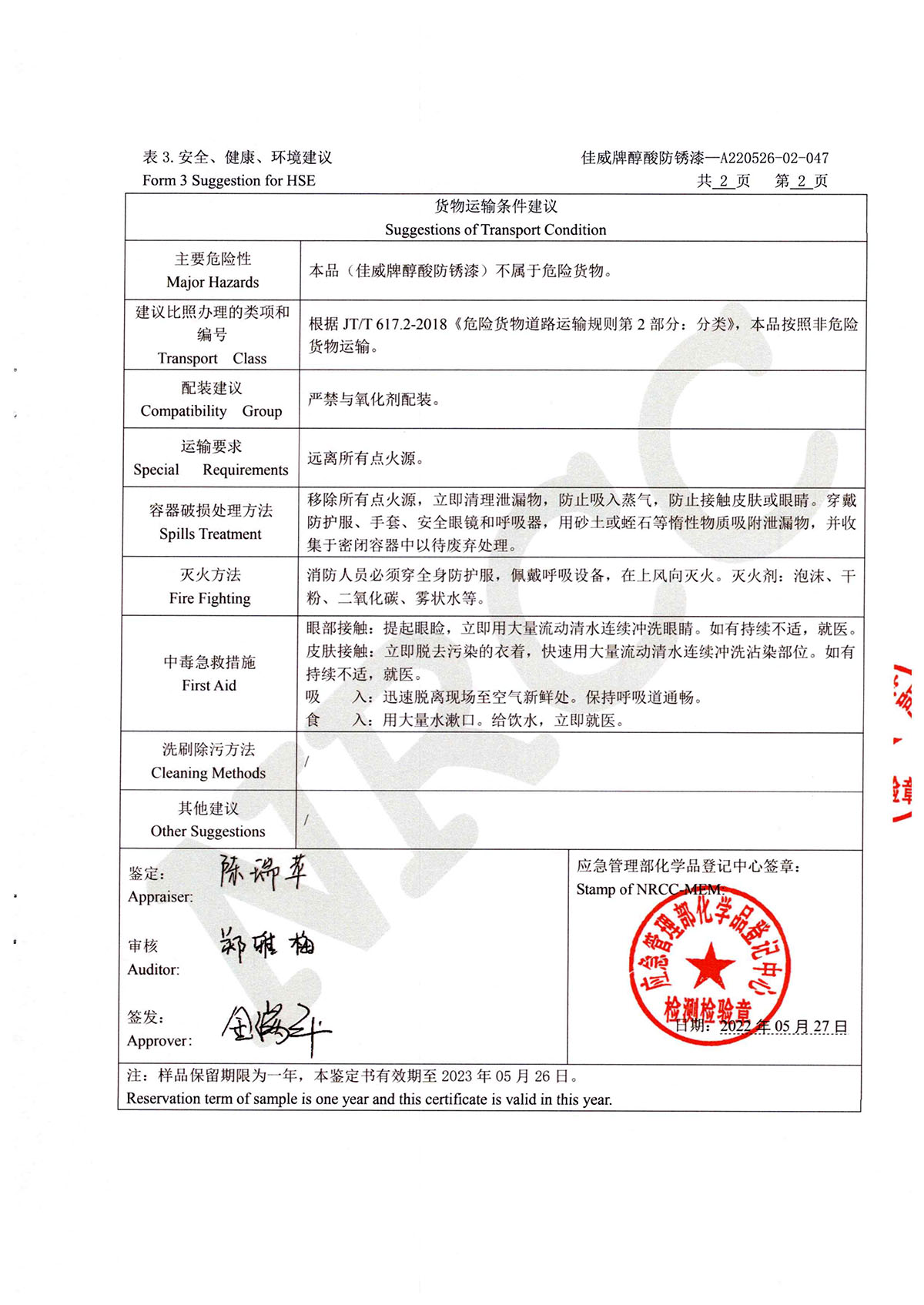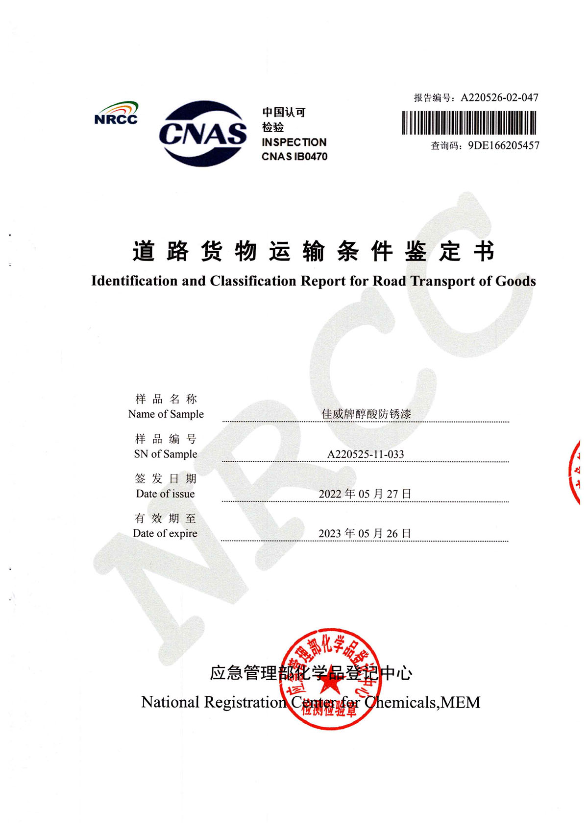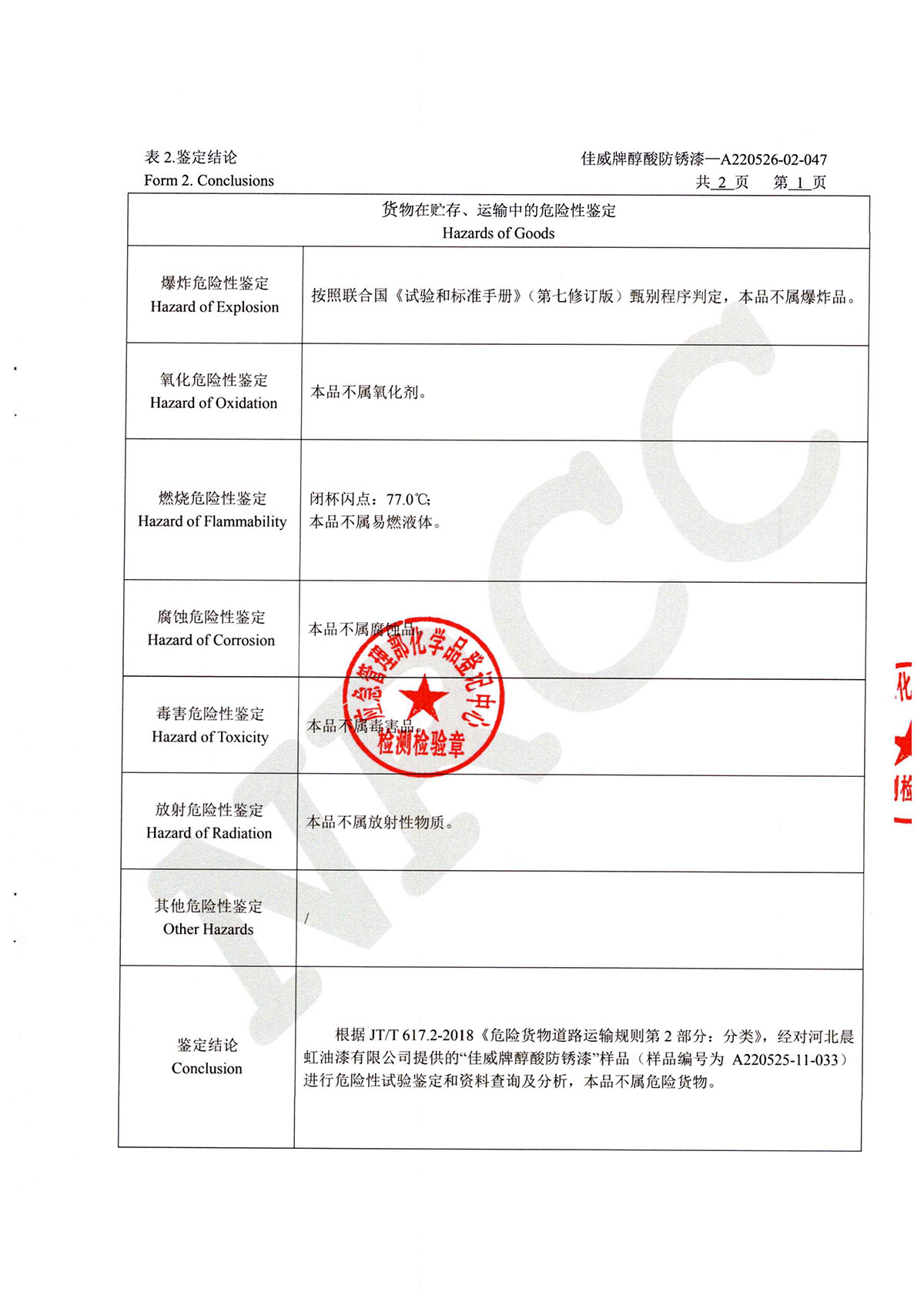 佳威醇酸防銹漆道路貨物運輸鑒定書