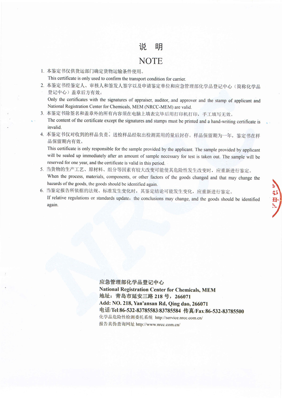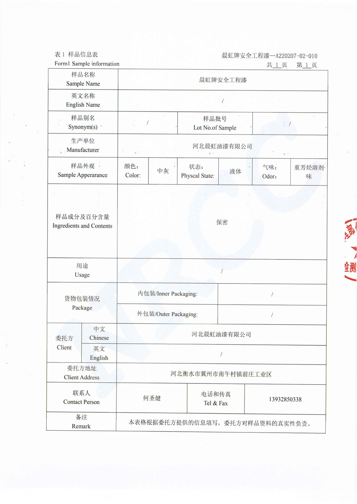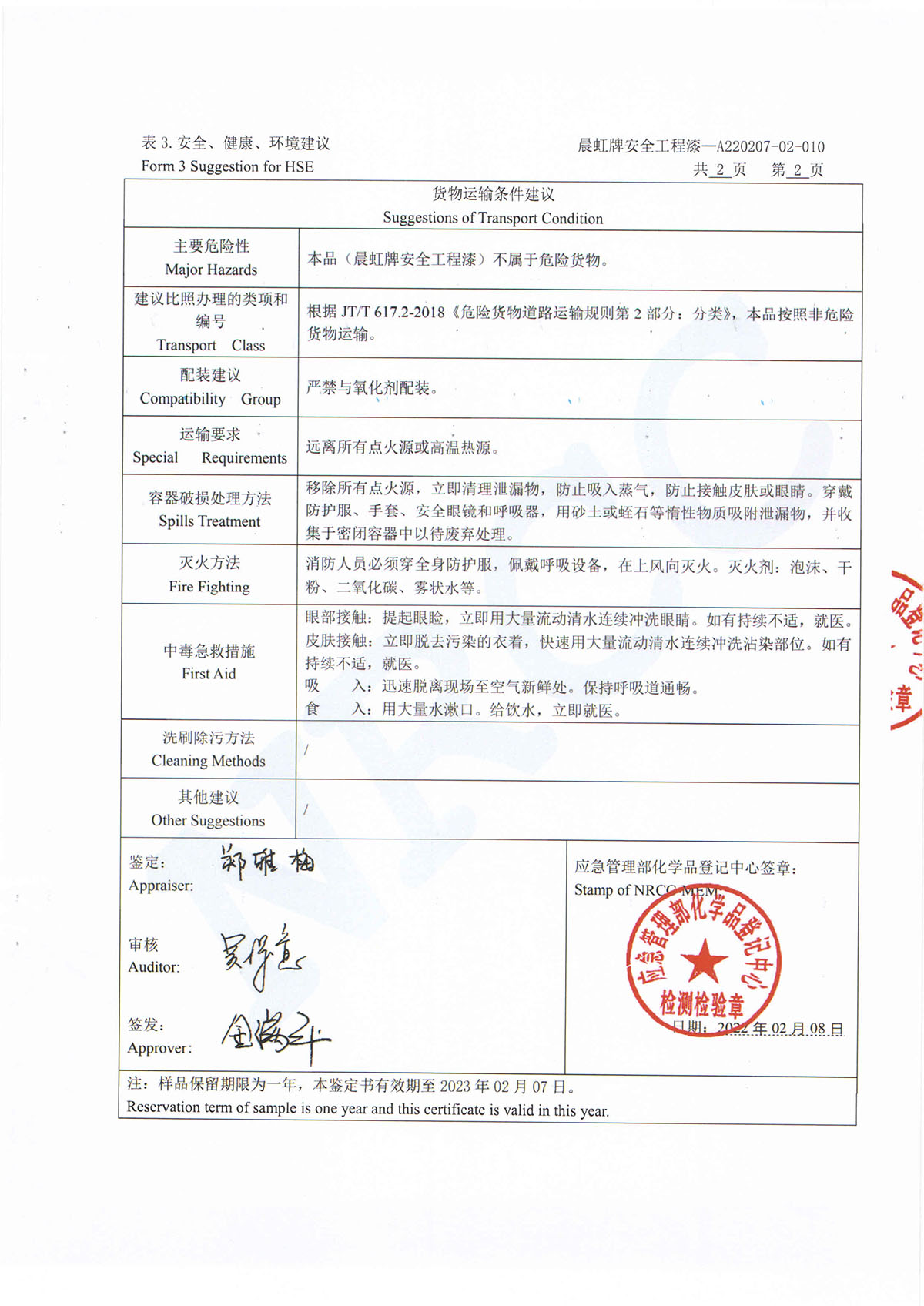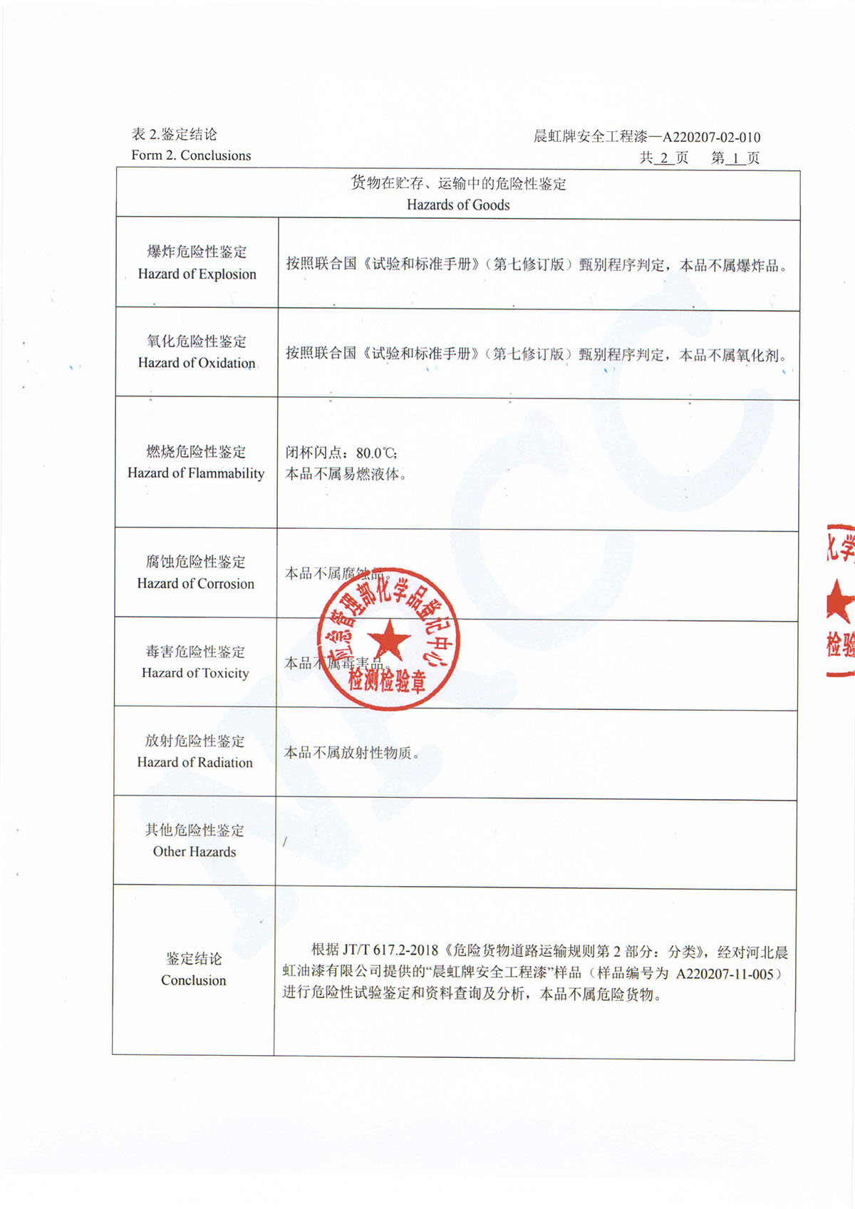 晨虹牌安全工程漆道路貨物運輸條件鑒定書